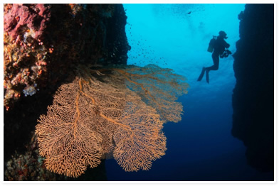 位於沖繩本島最北端的潛水區域, 最令人注目的是這裡的海底鐘乳洞, 進洞後是能上浮到水面的空氣洞, 洞中的景色非常迷人, 感受到大自然的奇妙。 邊戶岬的潛點都是以大深度的地形為主, 豪邁的drop off地形、密集的魚群、漂亮的軟硬珊瑚都非常吸引。